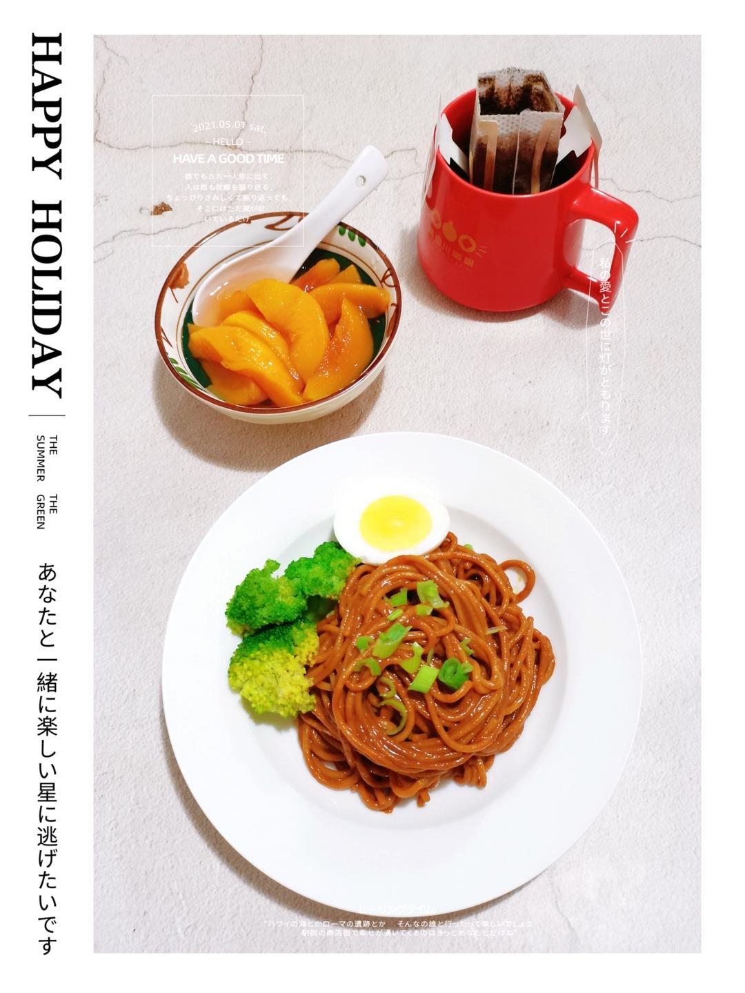 热干面 水煮蛋 西兰花 糖水黄桃 挂耳咖啡☕️