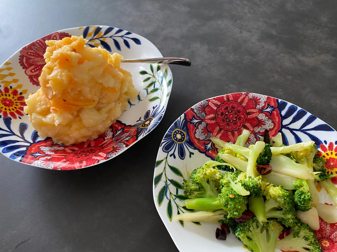 辣味土豆泥,炝炒西兰花。