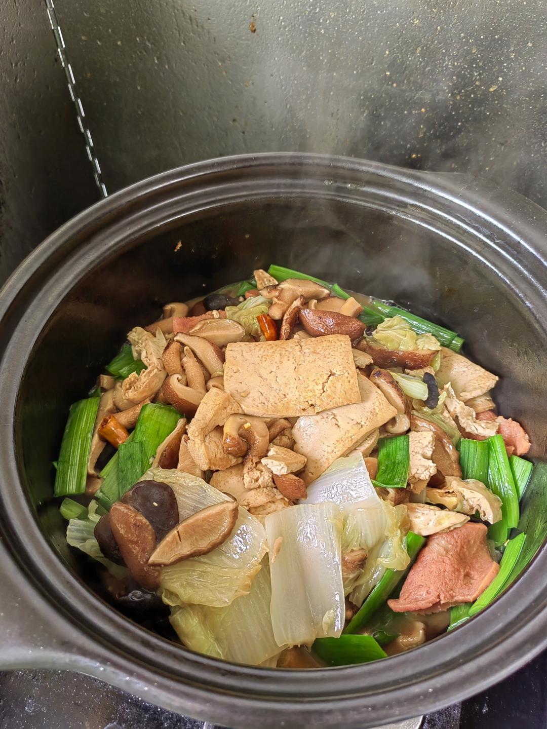 把五花肉换成了培根,孩子吃,只放了两个干的小米辣。加了一丢丢虾米。其他食材照搬。本来以为不炝锅味道应该会差点,又没有葱蒜...