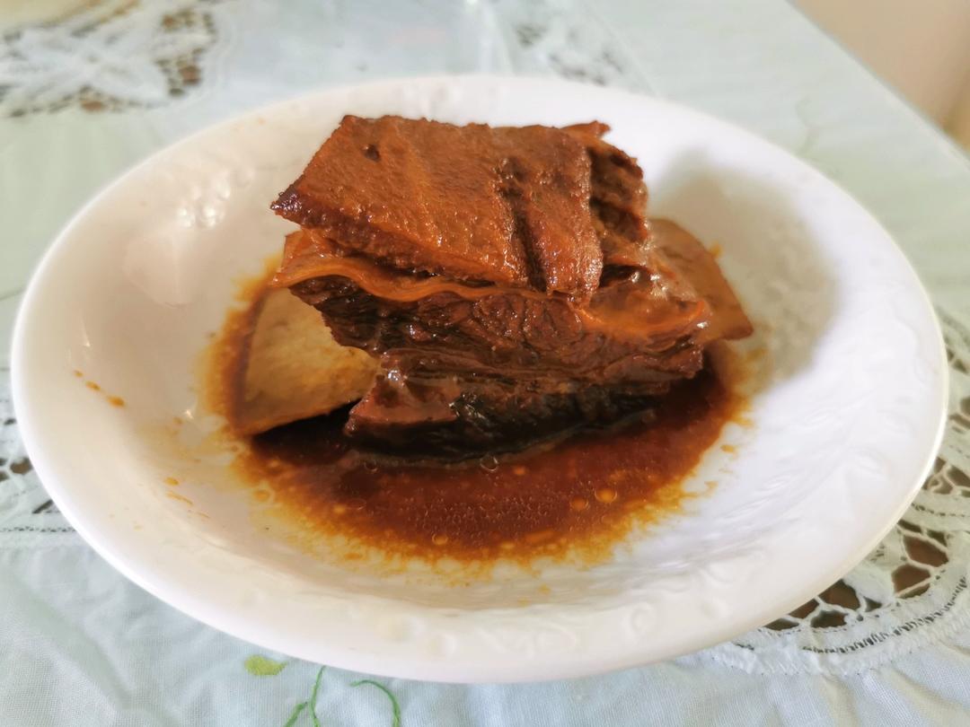 牛肋骨姜片入锅,翻炒,加黄酒、生抽、老抽、桂皮、大料,加水大火烧...