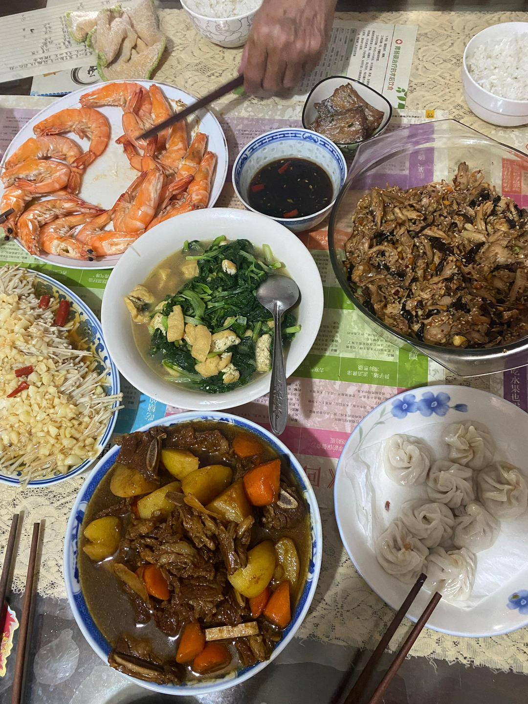 10.1 土豆胡萝卜炖牛排,黑木耳黄瓜凉拌手撕鸡,鸡汤蚝油豆泡炒小青菜,蒜蓉金针菇、白灼...