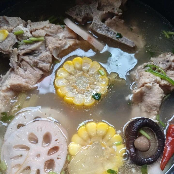 妈妈爱吃,未放酱油!白芷,藕,香菇,玉米,事先焯好的排骨,姜片,醋,盐,山楂一个,葱白带须子,冰糖,电饭锅做有汤汁,辣椒...