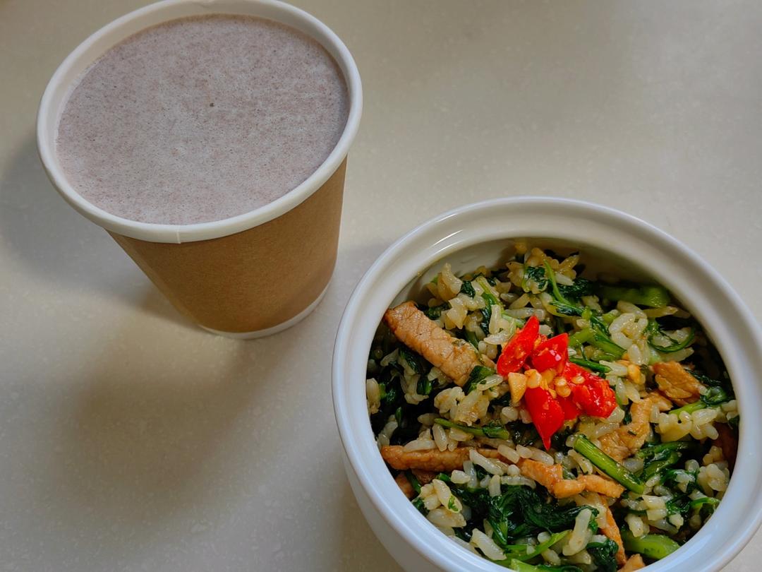 茼蒿肉丝菜饭,红豆沙牛乳。