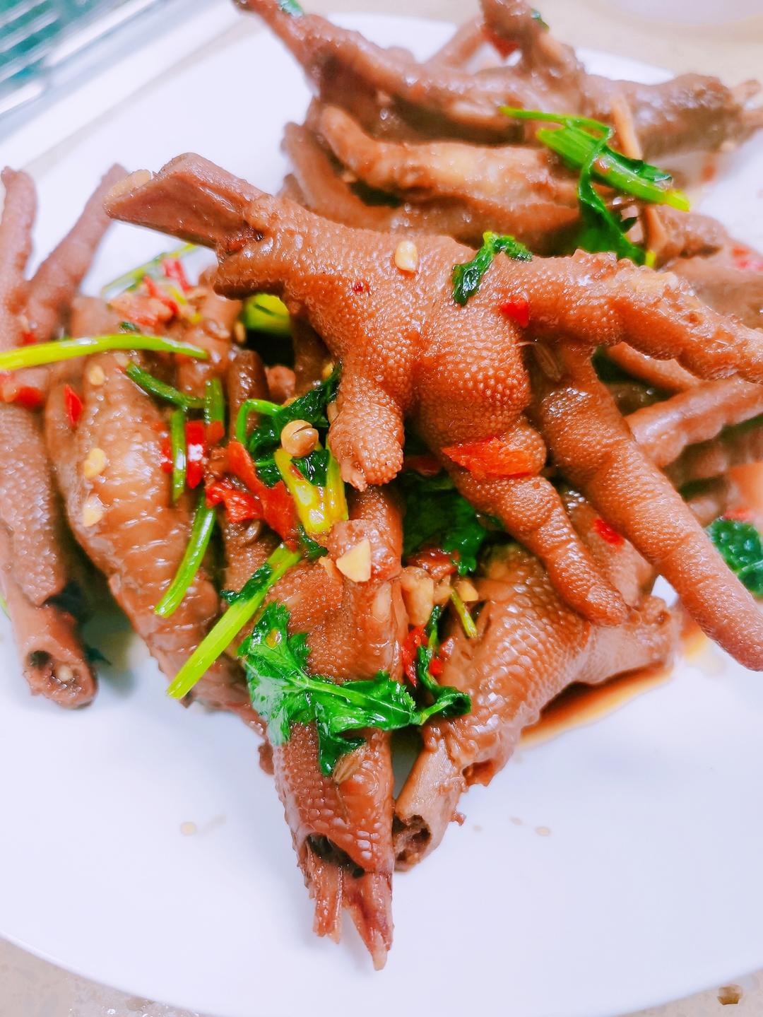 香菜炒卤鸡爪(卤鸡爪一袋,香菜适量,锅中倒入油下卤鸡爪翻炒一下,加香菜段,剁辣椒,鸡精,...
