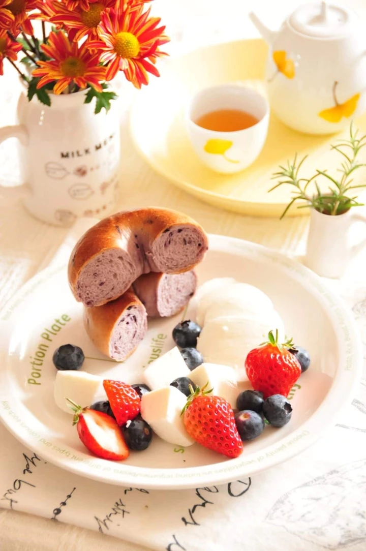 蓝莓贝果、水浸马苏里拉干酪、蓝莓、草莓,茶。