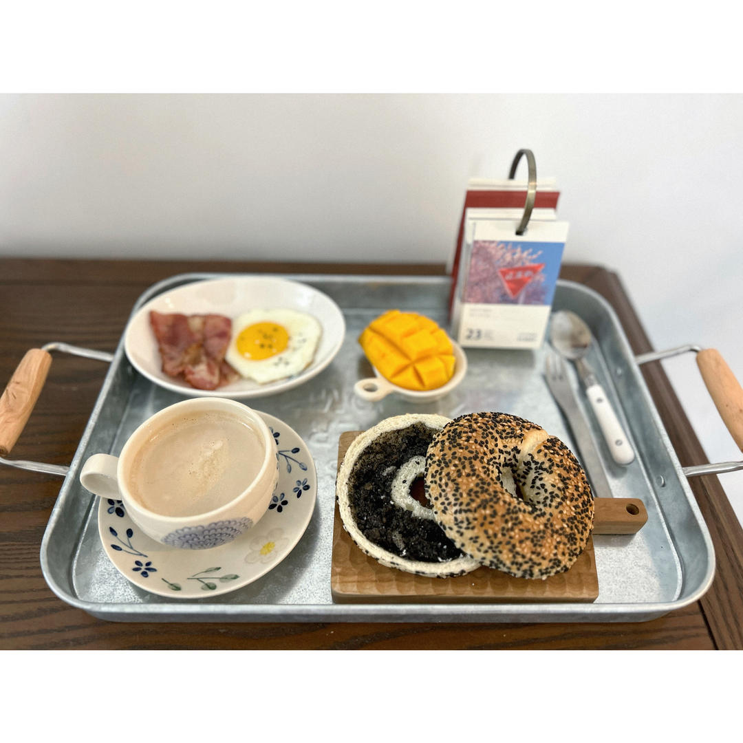 黑芝麻贝果、煎蛋培根、芒果、胶囊咖啡