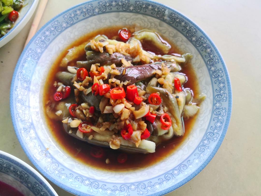 手撕茄子,青椒肉丝,红苋菜,空心菜梗