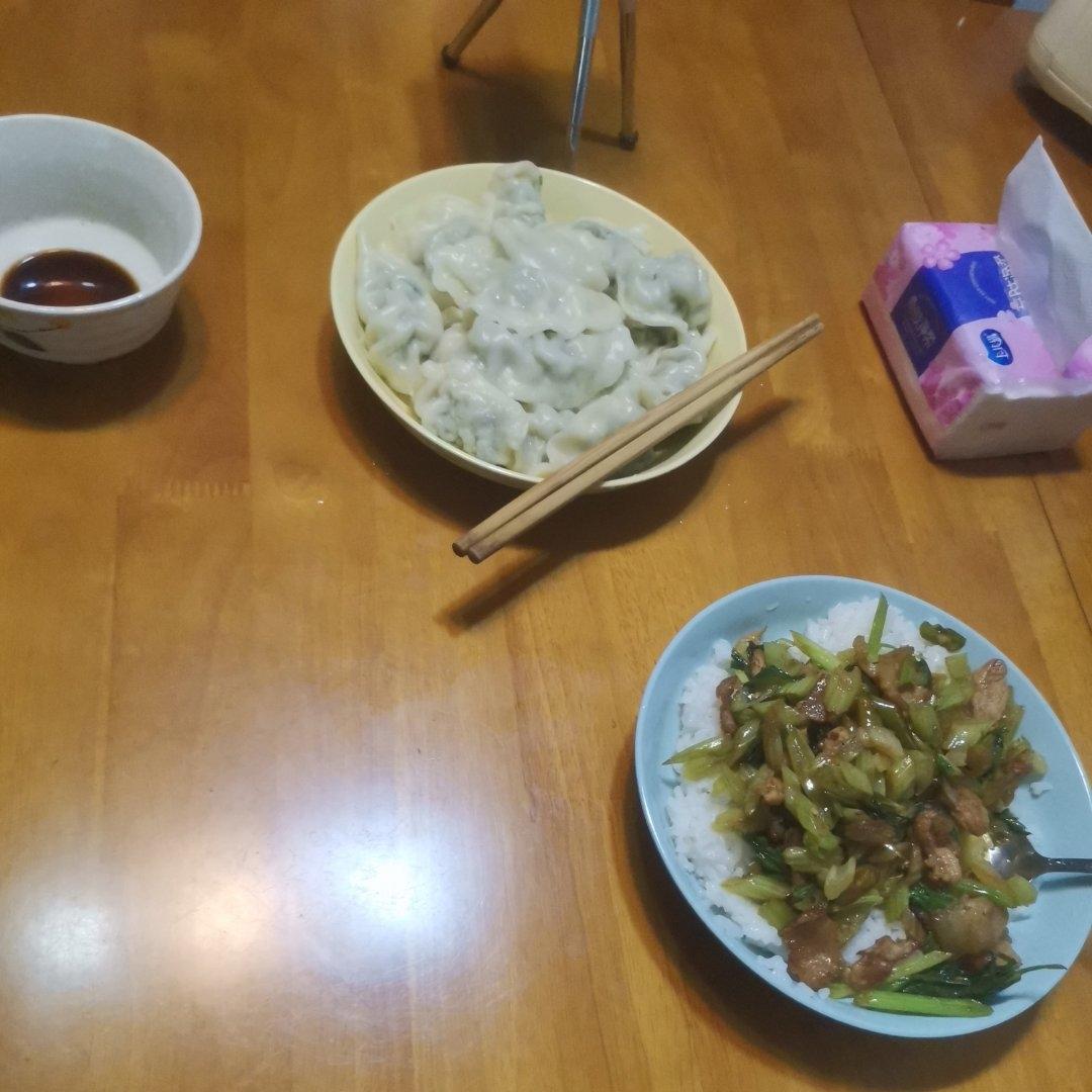韭菜鸡蛋饺子,凉拌莲菜,炖的鸡汤,准备的有点多,吃的太撑了。