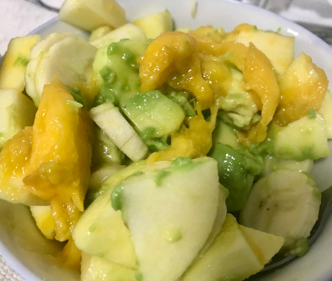 水果沙拉:🥑、🍌、🍎、🥭,百香果蜂蜜水