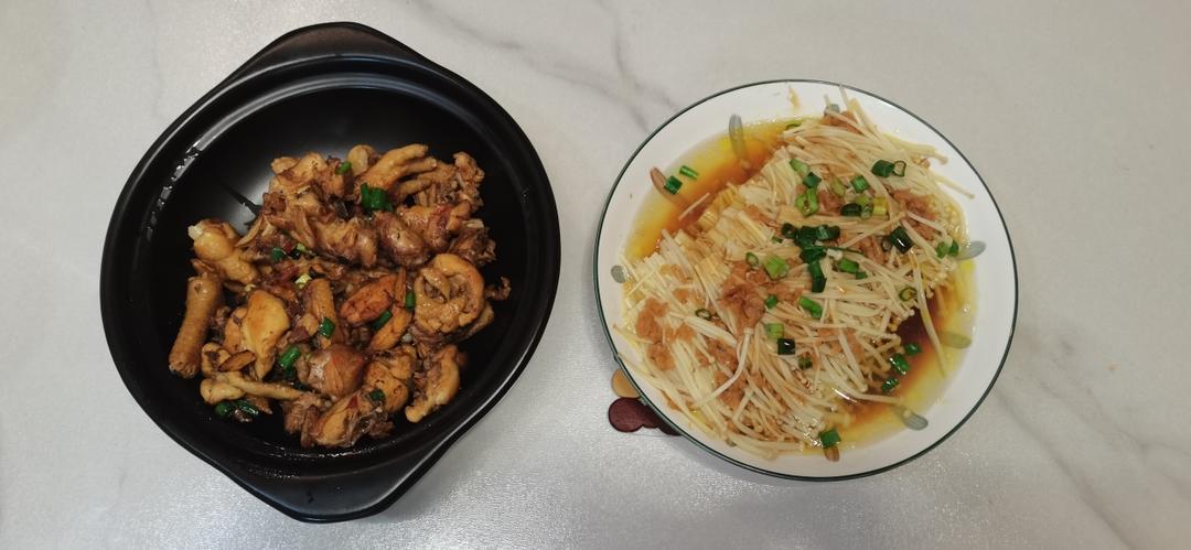今天和女儿两个的晚餐,蒸金针菇和闷鸡块