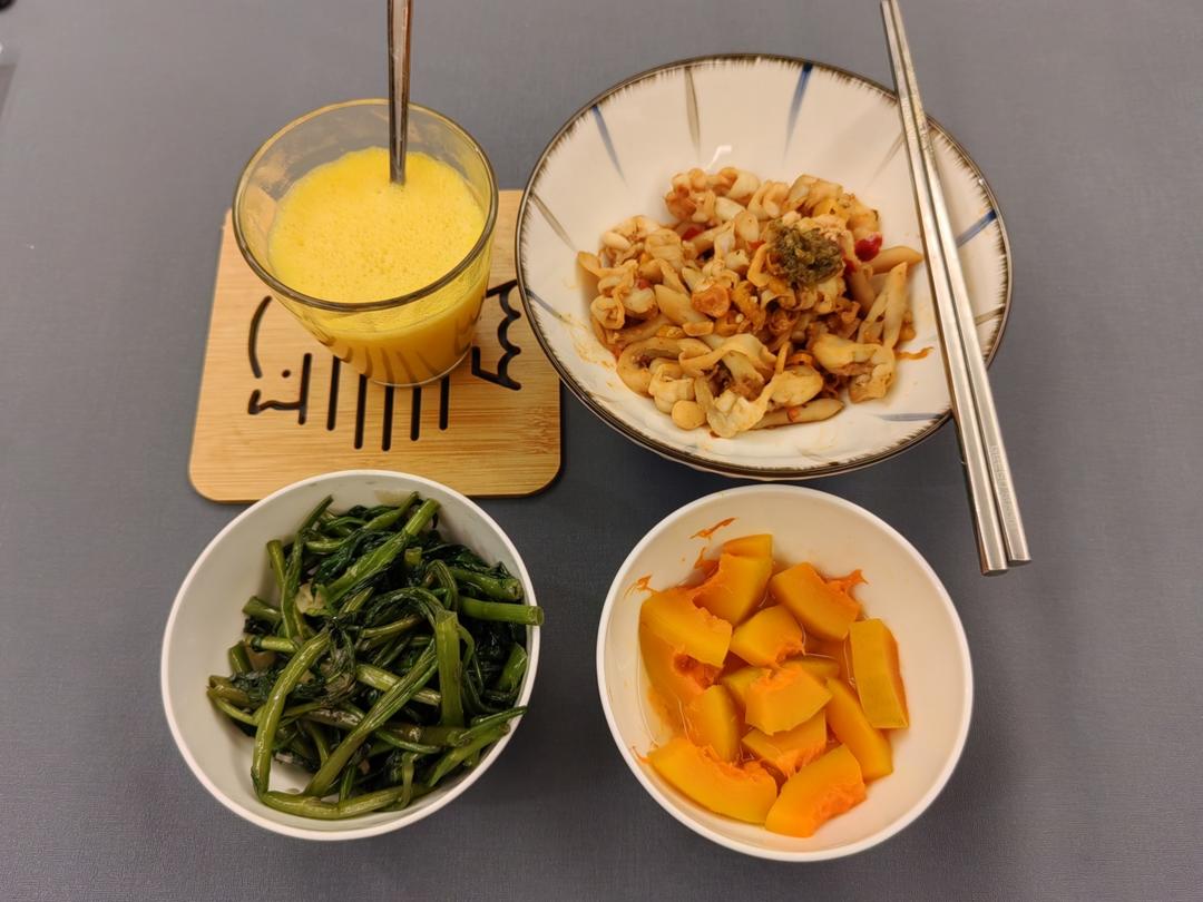 辣炒小象拔蚌肉,腐乳炒空心菜,南瓜糊,主食南瓜
