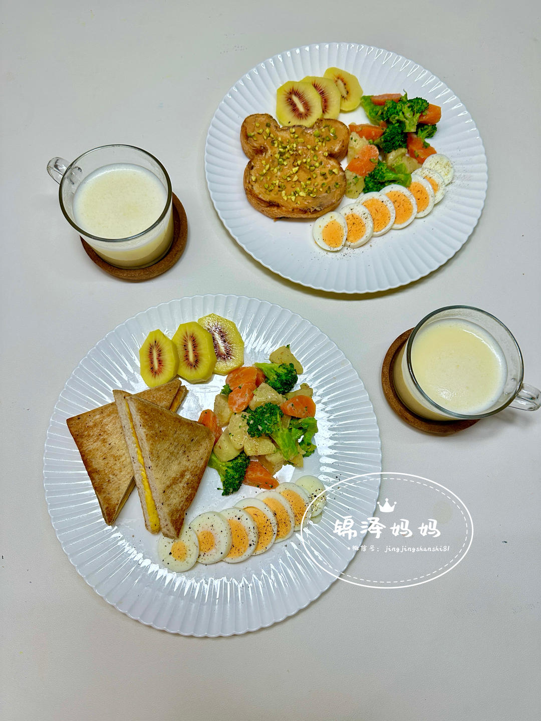 今日早餐:奶香玉米汁、花生酱芝士三明治、花生酱开心果三明治、西兰花土豆沙拉