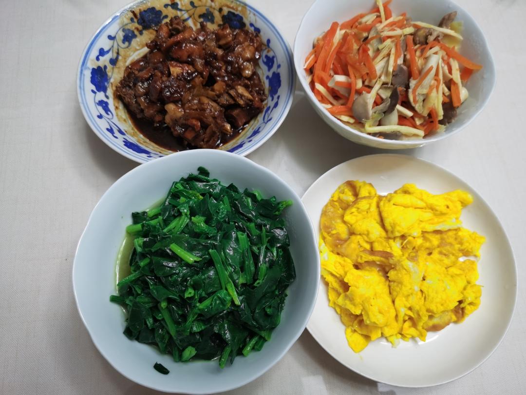 黑猪猪蹄,肉丝炒冬笋丝胡萝卜丝平菇丝,炒鸭蛋,大力菠菜