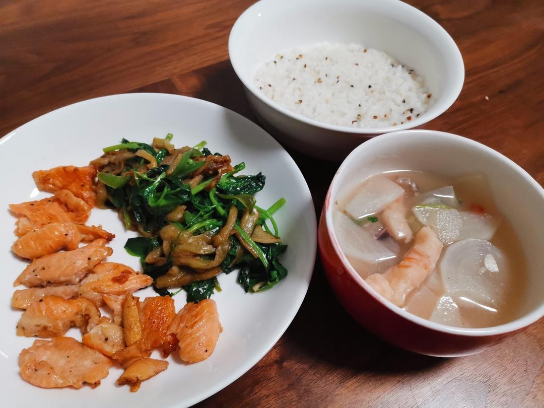 三文鱼茄子豌豆尖萝卜墨鱼虾滑汤