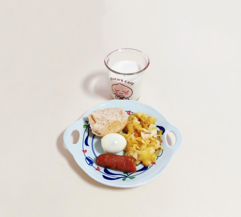 牛奶&馒头&鸡蛋&肉肠&炒丝瓜~牛奶里加了姜粉和山药粉。还是今早的量合适,除了菜少了点😄...