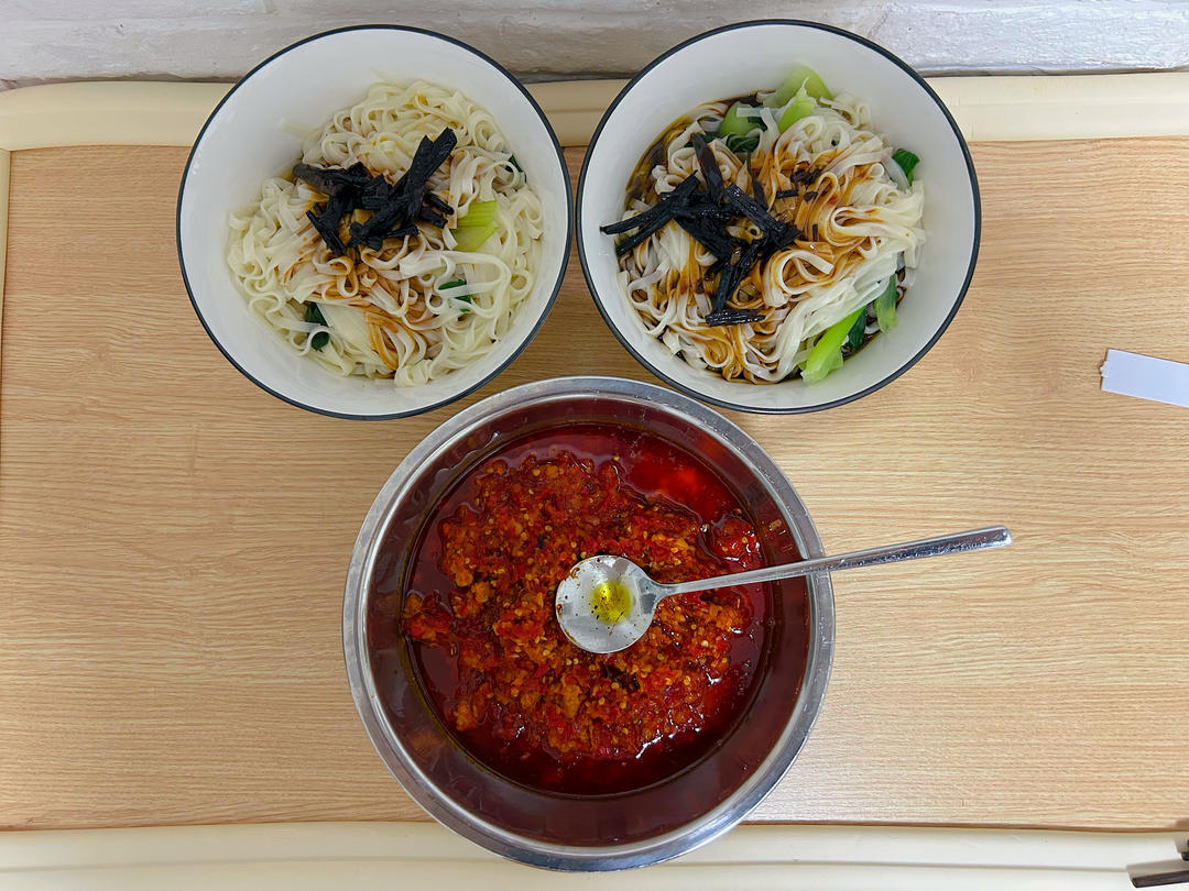 葱油拌面,辣椒酱。