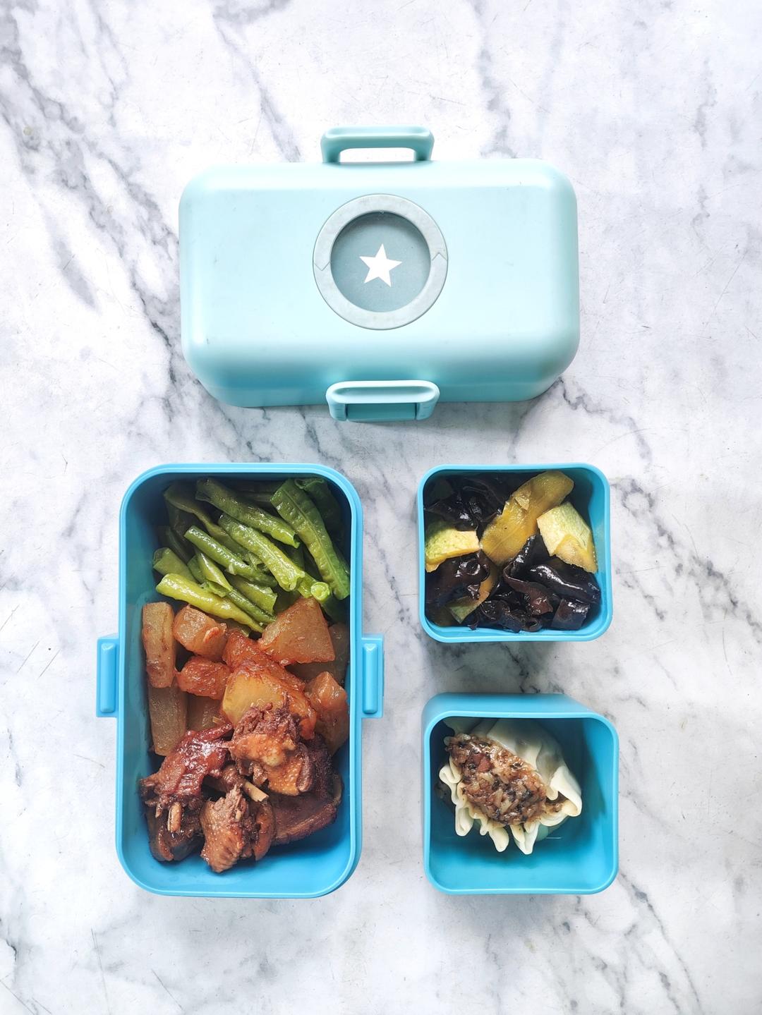 今日便当:清炒豇豆+虾皮冬瓜+红烧鸽子+黑木耳拌西葫芦+烧卖~~