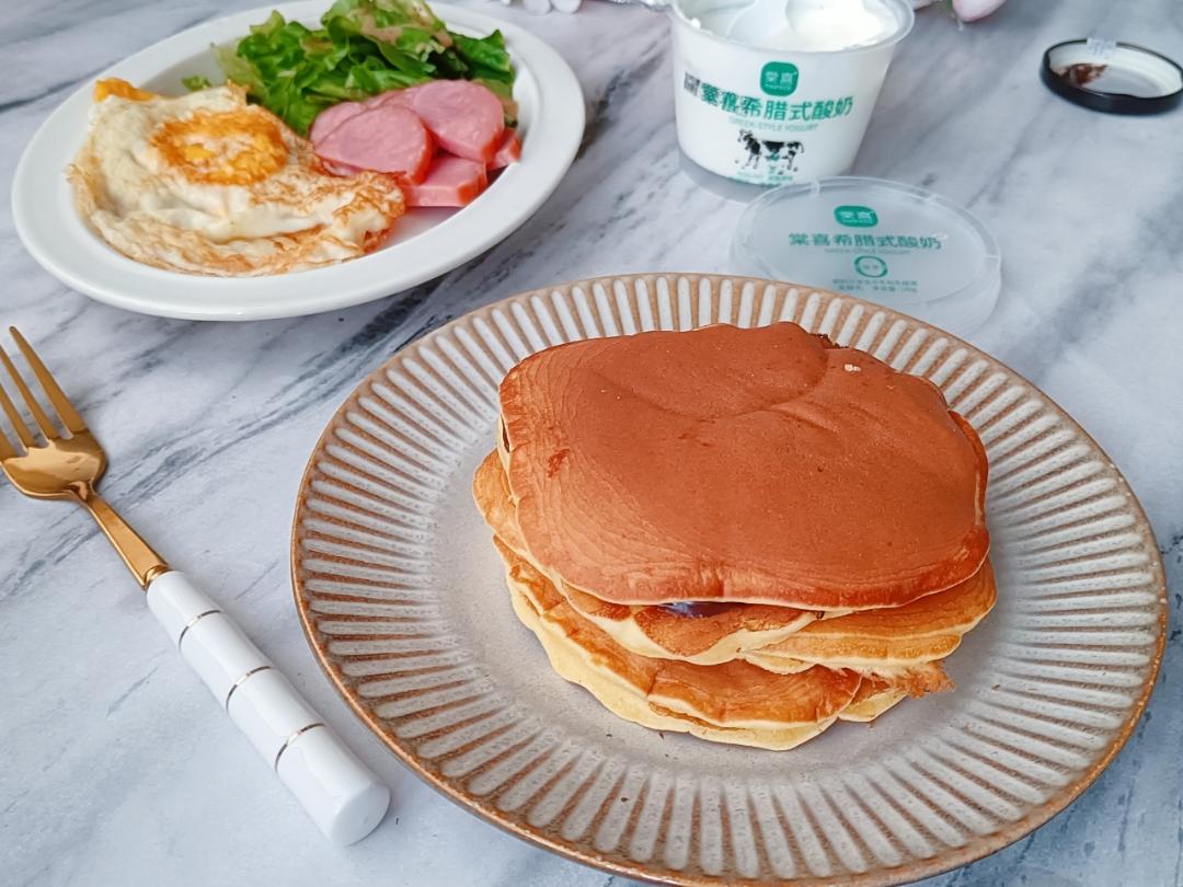 辰辰早餐:巧克力酱铜锣烧、生菜沙拉、煎鸡蛋、原味脱脂希腊酸奶