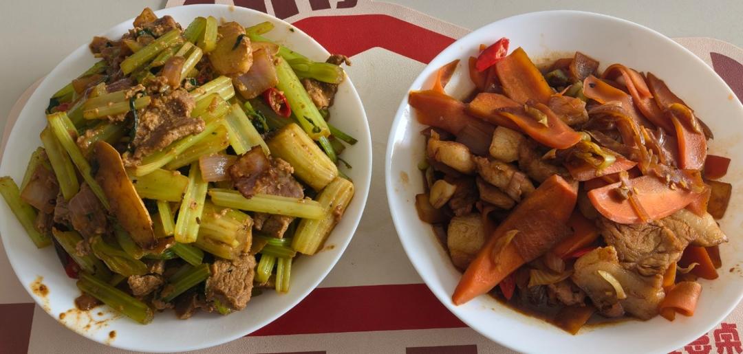 洋葱炒牛肉+口蘑青菜+韭菜炒鸡蛋+拉皮炒肉