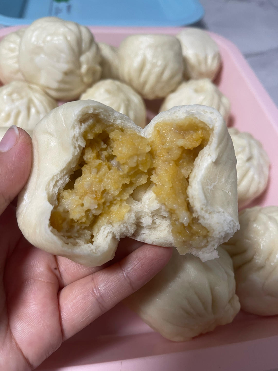 红薯泥+芋泥混合馅,加了炼乳和白糖,吃起来有奶黄包的感觉,感谢作者分享方子~
