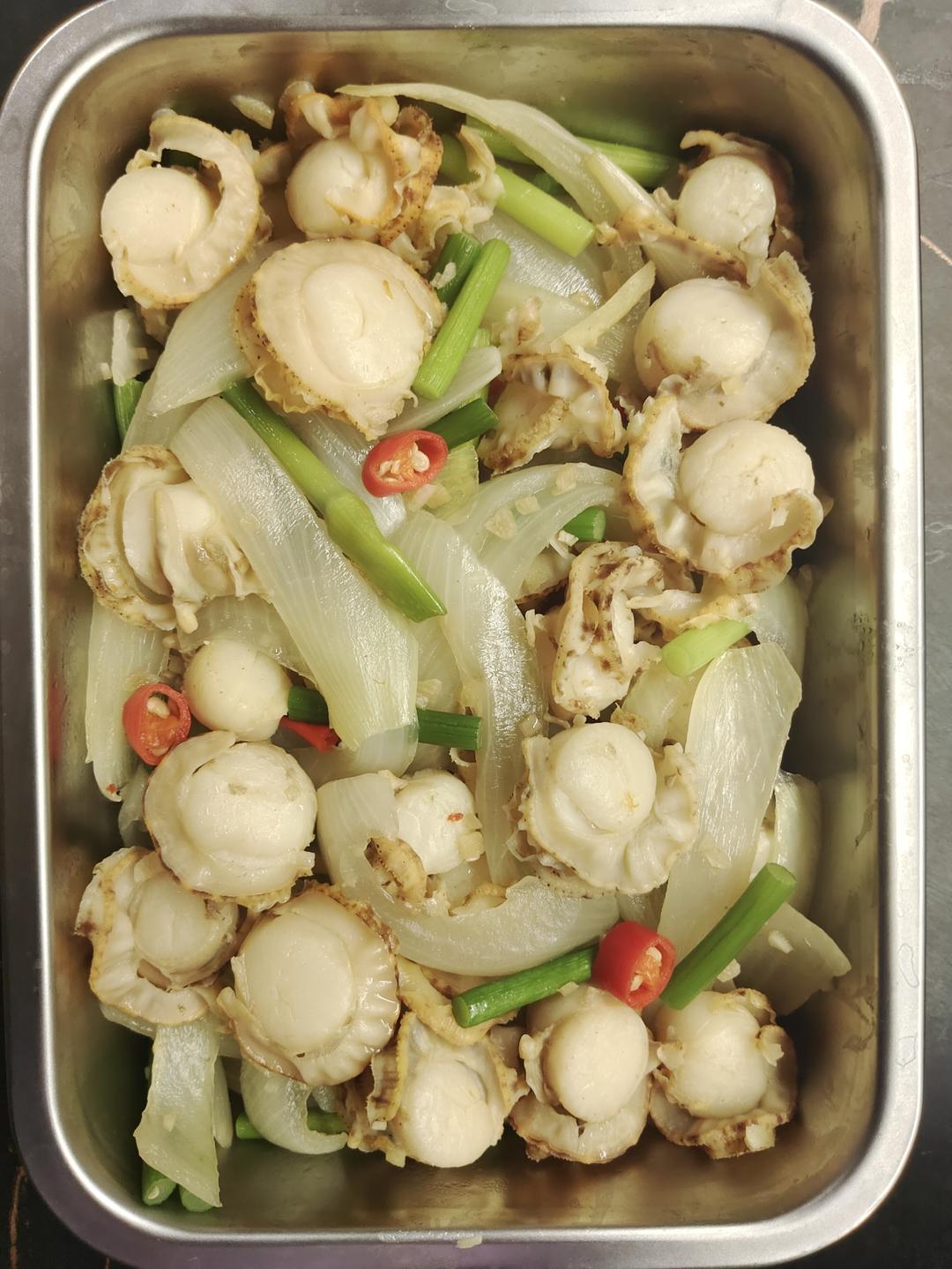 扇贝350g+洋葱半个+蒜苔6根+小米辣3根