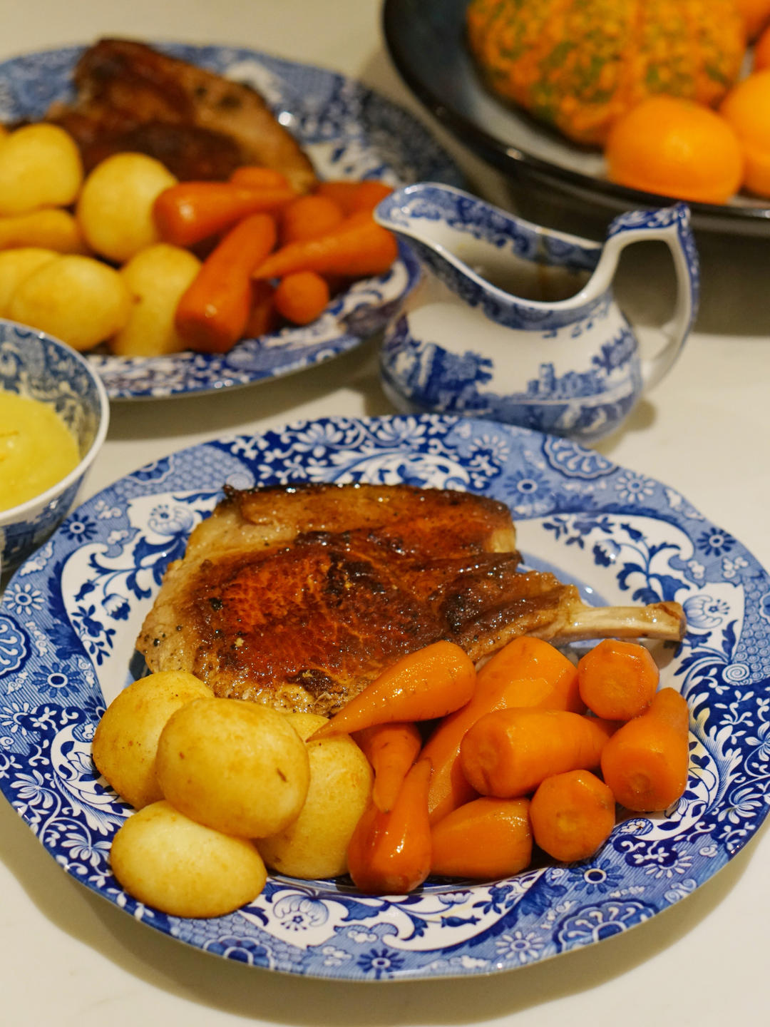 2.5厘米厚的战斧猪排,正面煎4分钟,反面煎3分钟,醒5分钟,外面焦脆里面肉嫩多汁,和鹅油土豆,蜜汁胡萝卜同食,他配桂花...