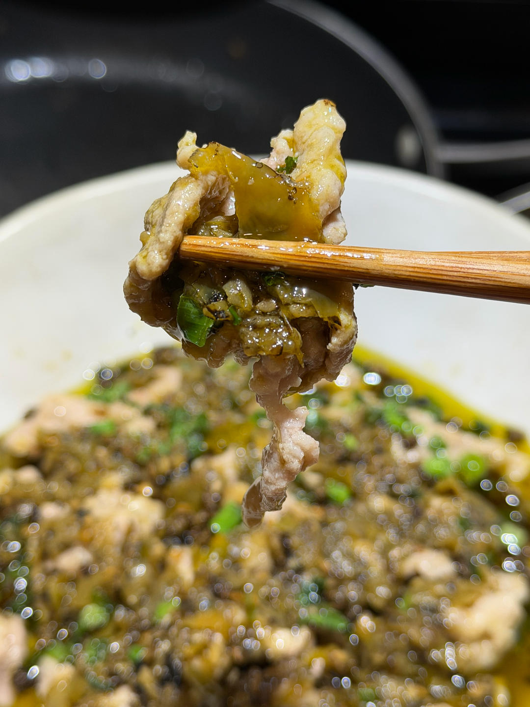 这是一个结合了滑肉,酸菜鱼,烧椒风味的水煮肉片菜。