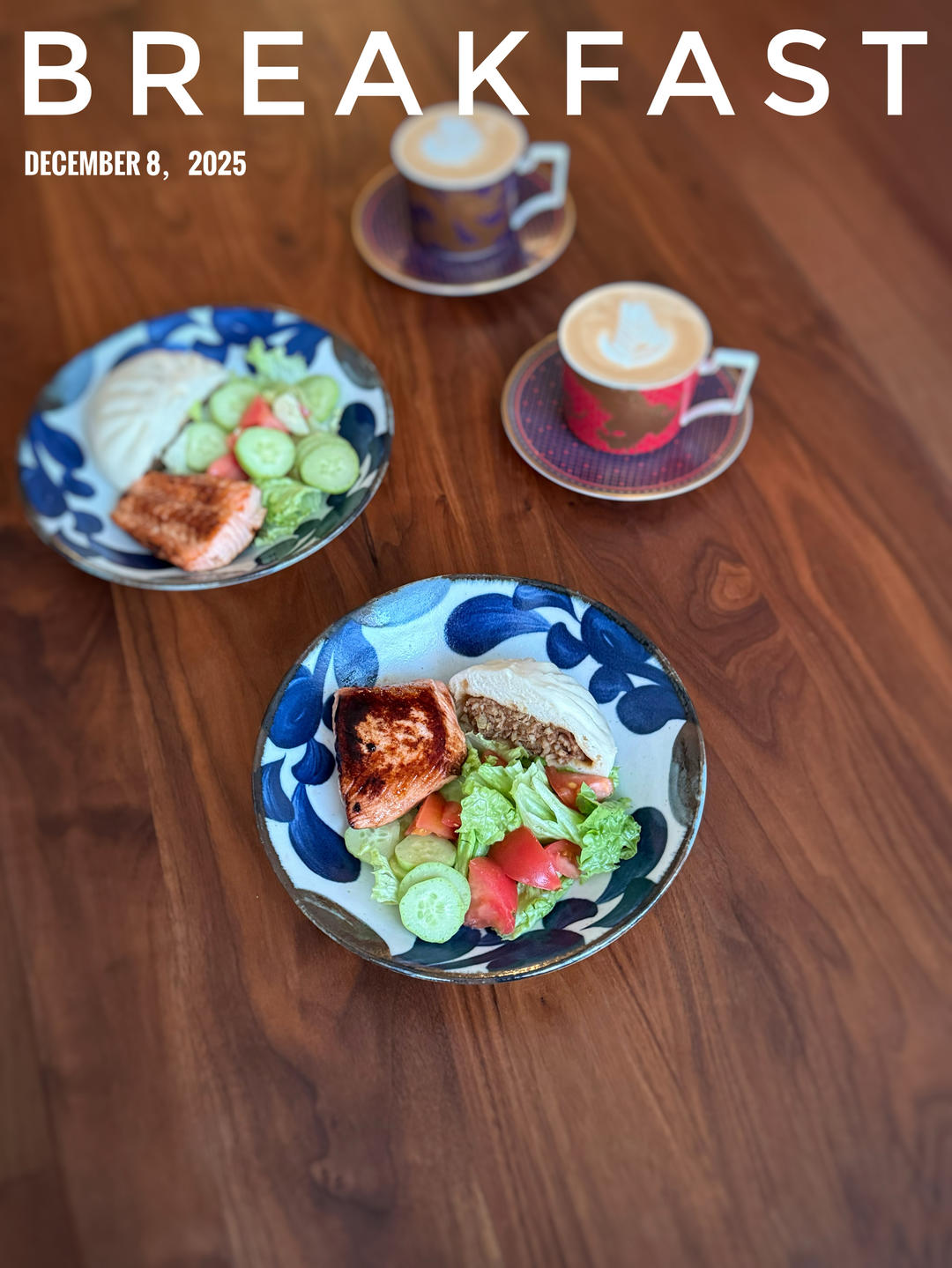 早,煎三文鱼、生菜沙拉、肉包子和拿铁。