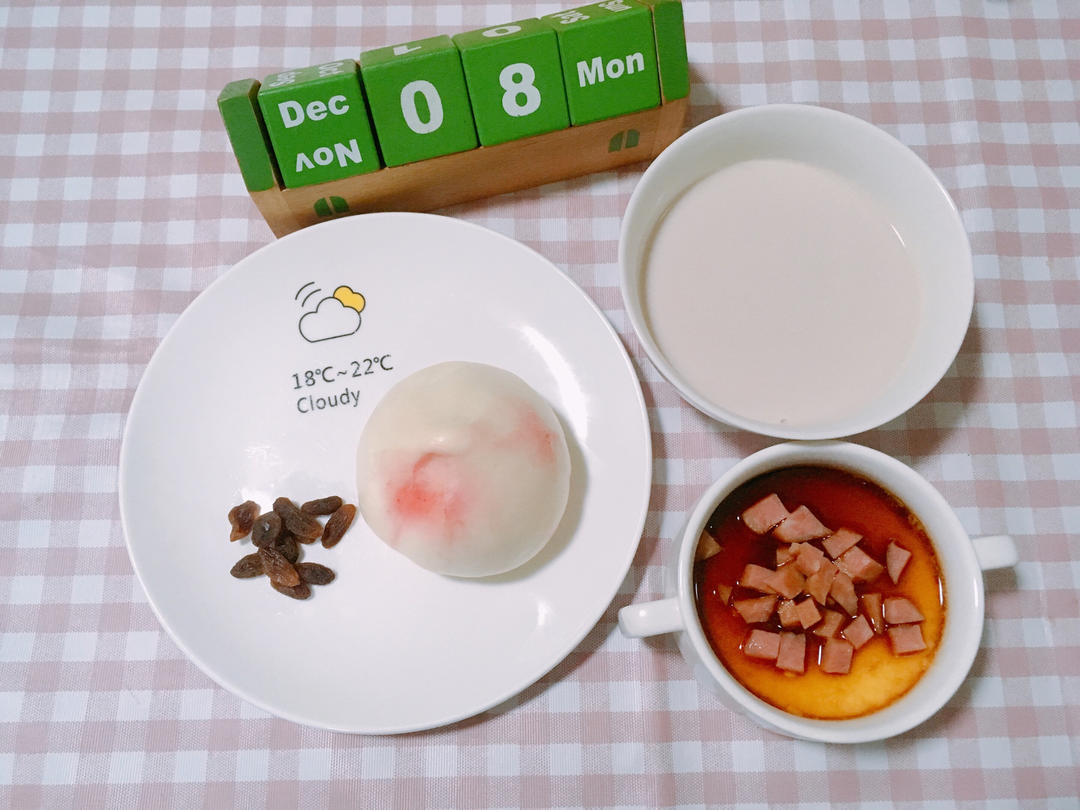 G9S1.W15Day1.寿桃🍑包加火腿丁蛋羹配核桃乳佐葡萄🍇干