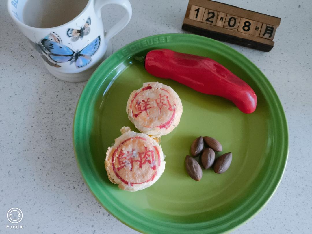 20251208早餐打卡2138:肉月饼,彩椒,香榧子,咖啡。早餐中国;