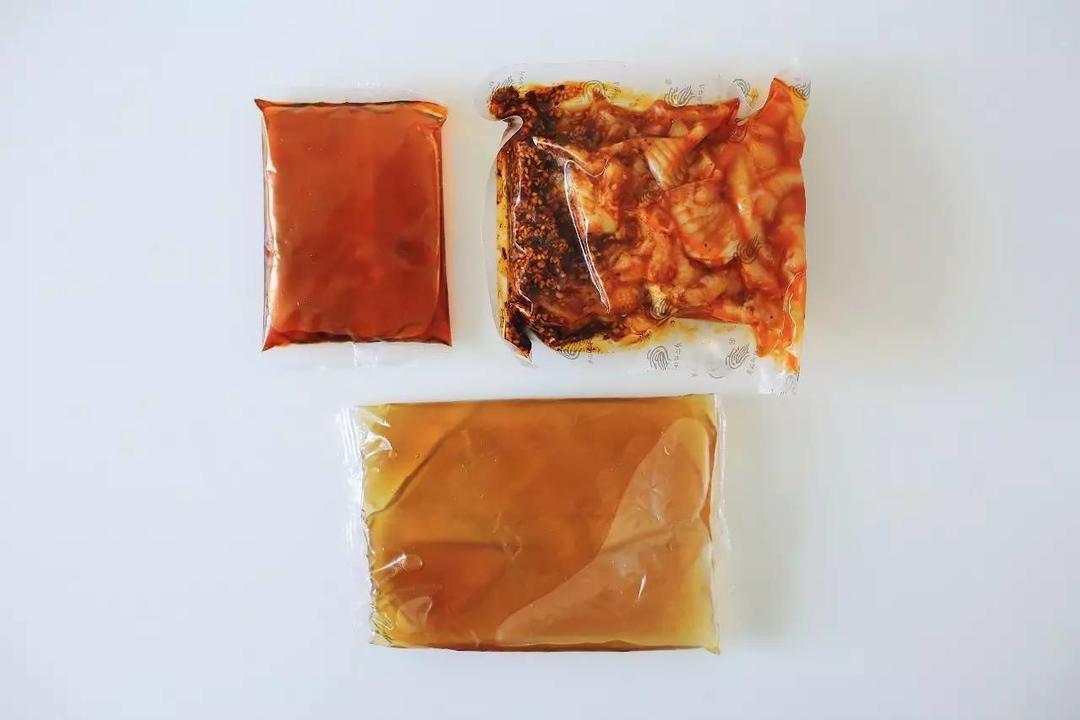 打开盒子,里面分装成了三个小包装,鸡肉包、红油包和高汤包。鸡肉包采用了真空包装,其他调料包也密封得很好,即使邮寄颠簸也不怕。