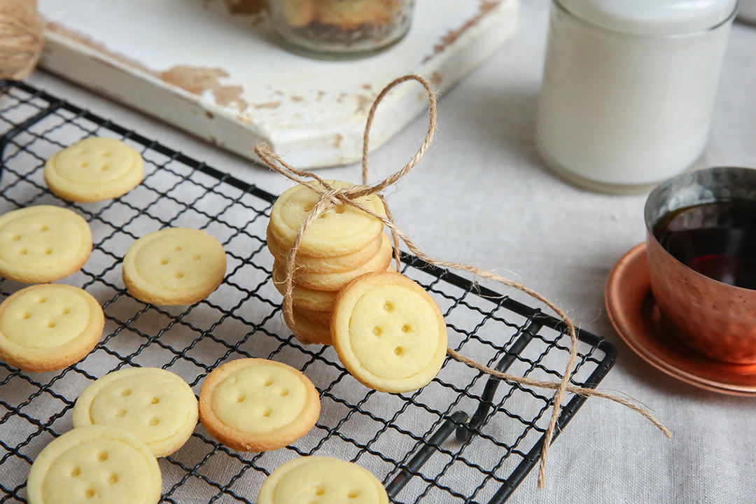 冷藏后擀平切出圆形,做成纽扣形状,放入预热好的烤箱中层170度烘烤12分钟。