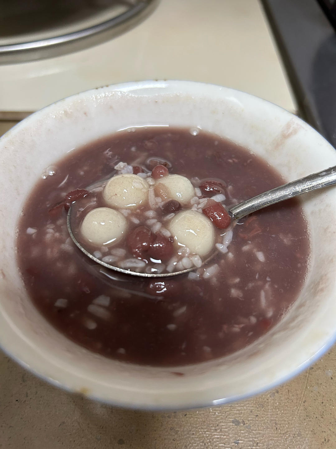 去年十月做的豆沙(手动压烂保留了些红豆颗粒,偏稀没有炒过,一直冷冻囤着😅)正好派上用场,比浸泡红豆慢慢熬汤要方便多了~圆子是前阵子搓的抹茶白巧糯米丸和自制芋圆。放了三大勺酒酿和小半包红糖姜茶粉,估计是本来豆沙也加过一点糖的缘故,整体略微偏甜,但很好喝😍!两种圆子以前单独吃都感觉平平无奇,这次配酒酿红豆羹绝妙(其实光是汤底就很美味了🤣),抹茶小圆子(糯米团里加了融化的抹茶白巧生巧)嚼着嚼着还隐约能吃出白巧的味道😋