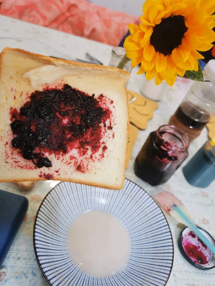 蓝莓有点酸,多加了一些冰糖,昨晚做今天早餐吃,配面包味道酸酸甜甜,外加养生红枣花生豆浆,nice~#早餐•2021年11月26日#