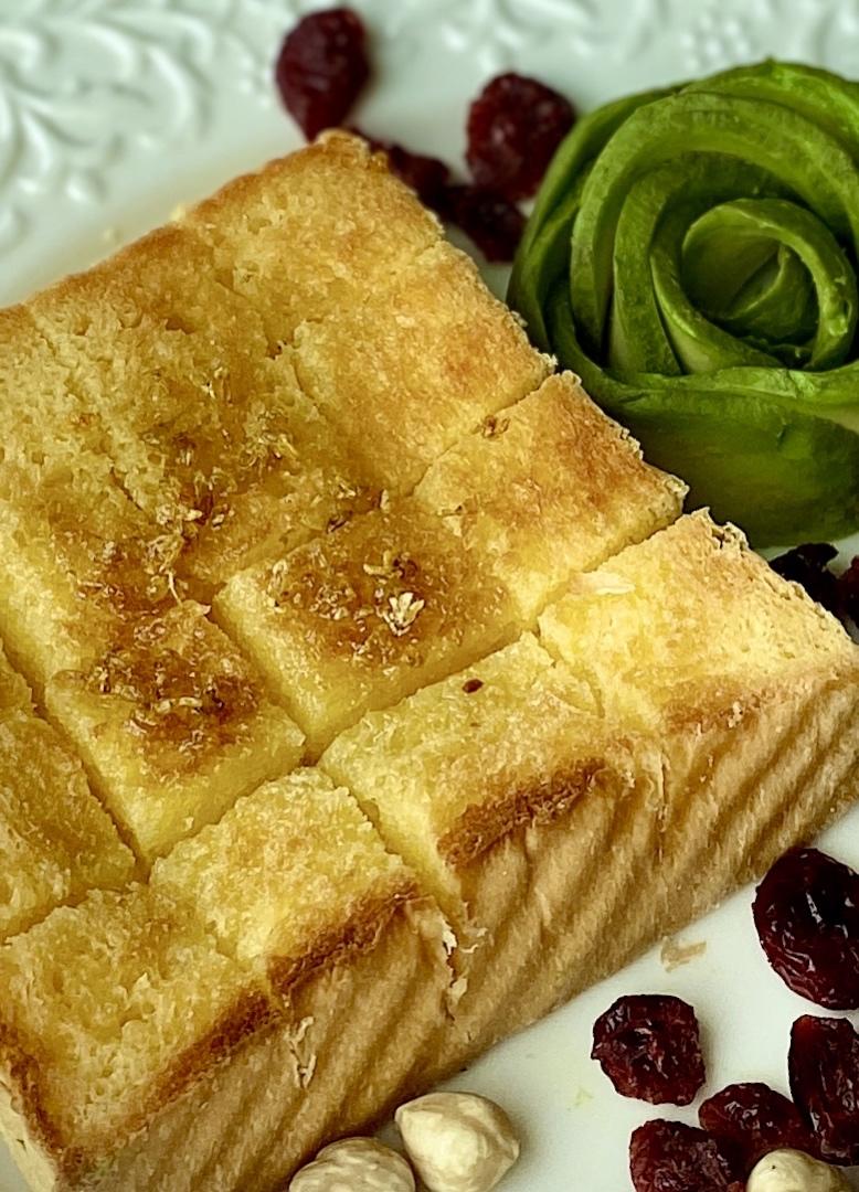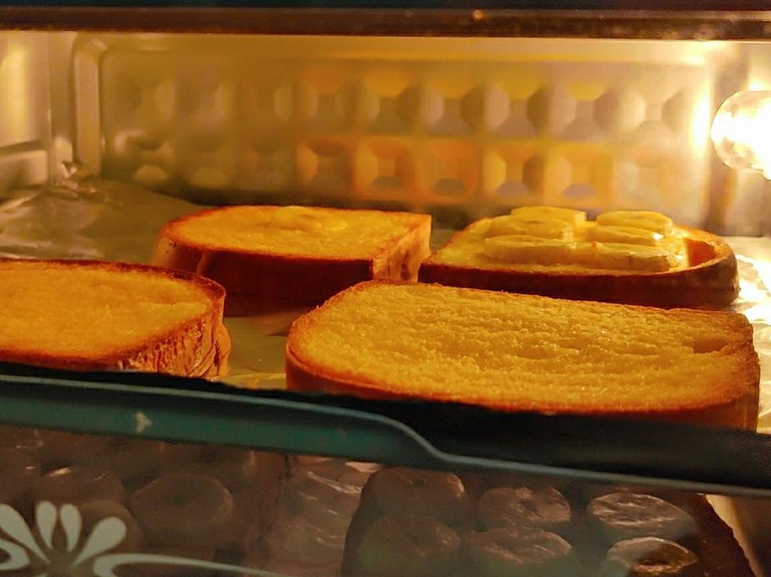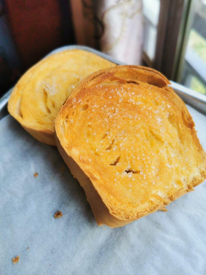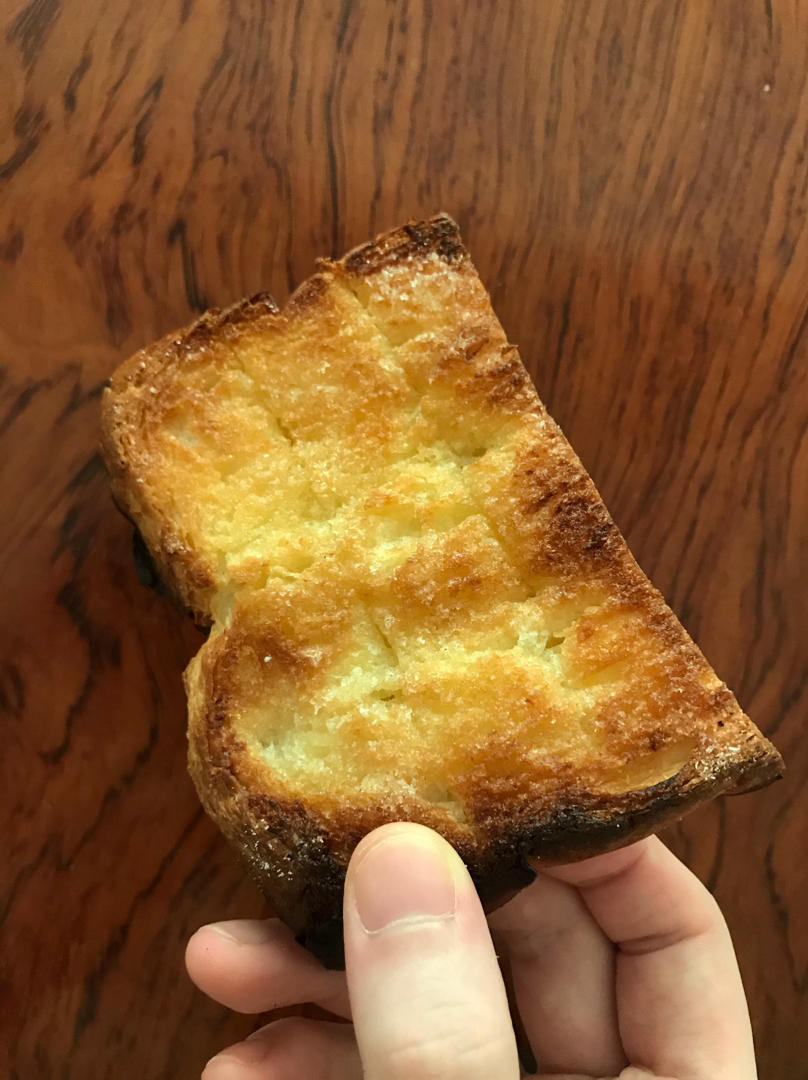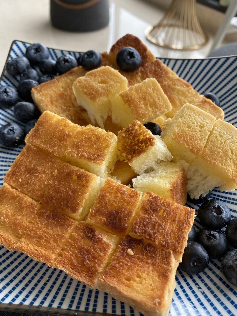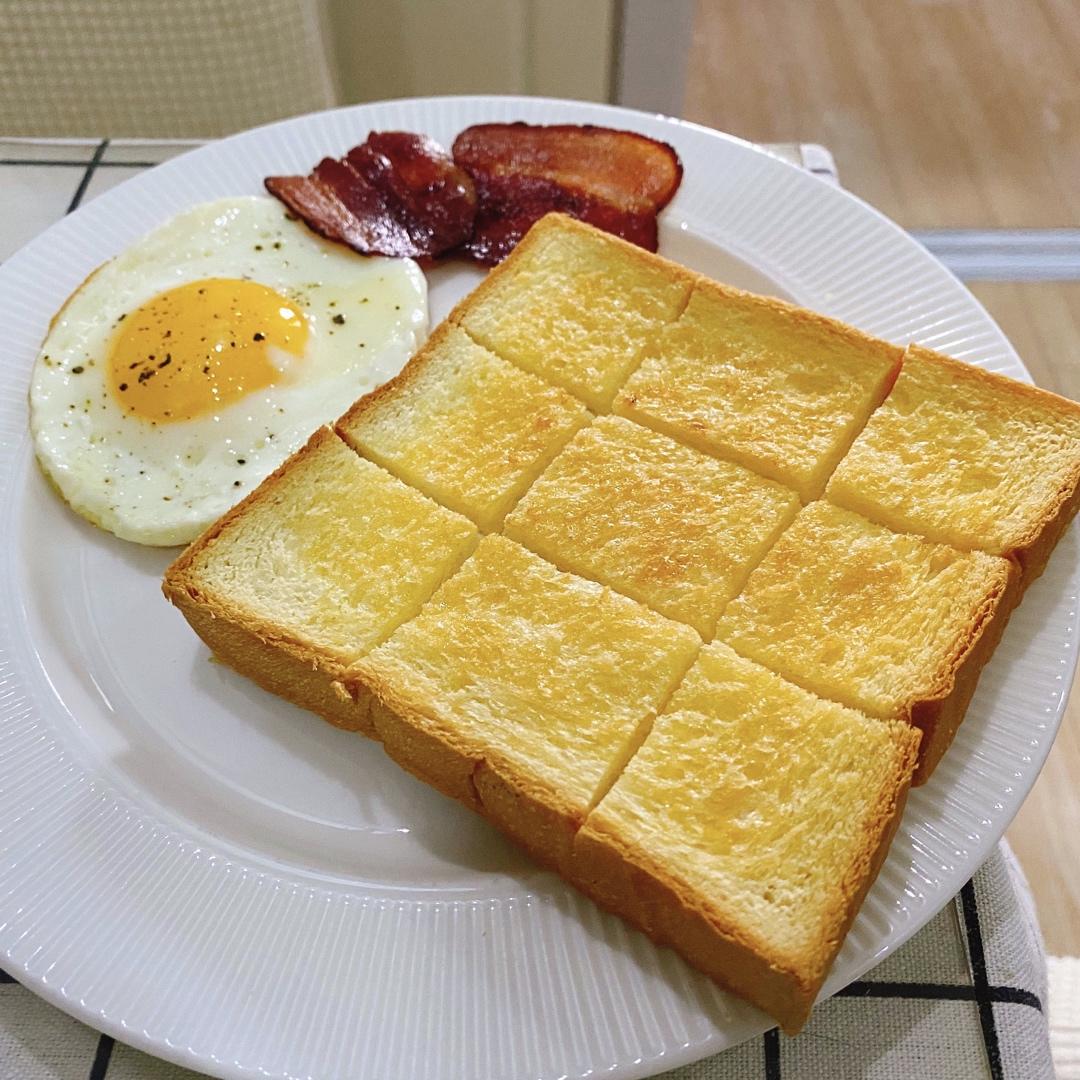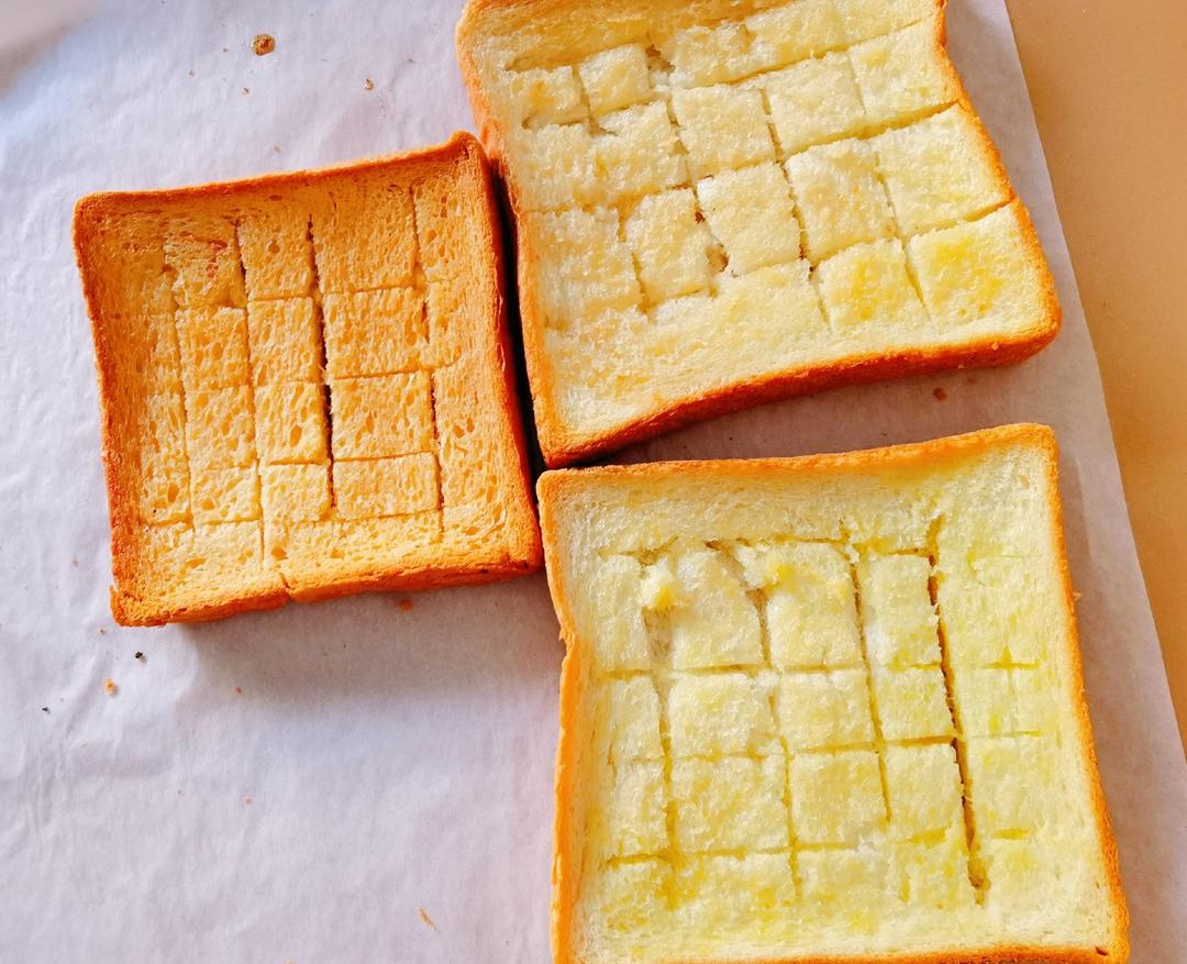 用的只是半块吐司,5g左右的黄油混合4g蜂蜜涂满表面是足够的啦,表面还撒了3g糖(用的是代糖,像是绵白糖的细腻程度,应该改成大颗粒一点的砂糖吃起来会更有感觉!)最后吃起来稍稍过甜,下次试试用黄油量的一半的蜂蜜😅这次其实黄油也涂多了,吃到最后油渗透下去湿软的部分会觉得腻,不过也跟我吐司切片的薄厚程度有关,如果切成厚片吐司就会有口感的过度,不会像我因为这次吐司薄才感觉除了脆顶和脆底中间就只有全被顶部黄油渗下被浸润的部分,讲道理这个吃法就该配厚切片才有灵魂!!总之,好吃!