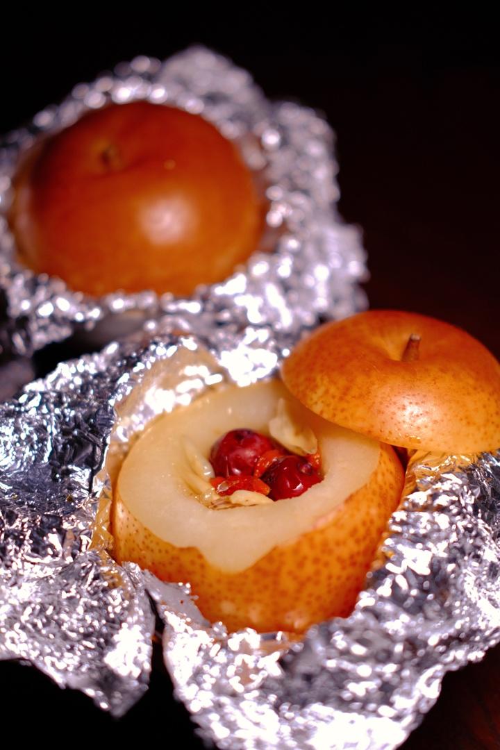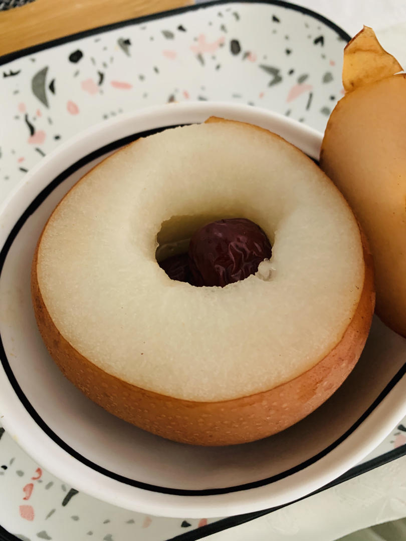 烤了两个秋月梨,加了冰糖,枣,枸杞。百合没有塞进去,我的烤箱一开始摁错温度230烤了20分钟,后来250烤了30分钟,反正烤软了,很好吃,有一个梨掏的时候掏漏了,梨汁直接流碗里了,反正都是要吃掉的