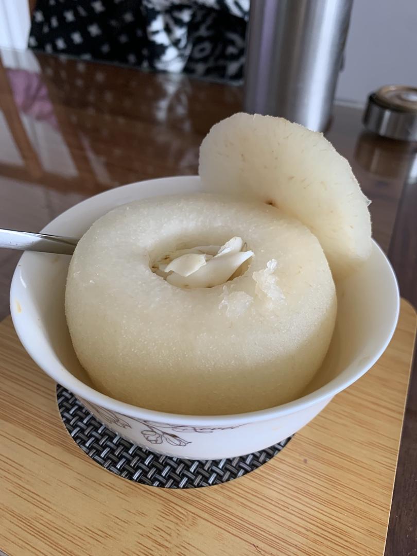 #晚餐•2020年3月26日# 烤箱230度要一个半小时,微波炉不错,10公分的大梨最高功率只要8分钟,小的时间更要短,不然烤蔫了。烤的时候要用碗扣严实,而且上面的碗一定要比下面的碗小,不然水全跑没了。