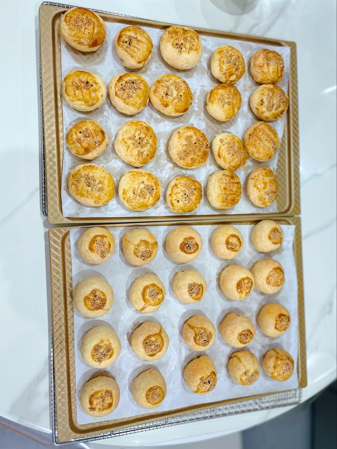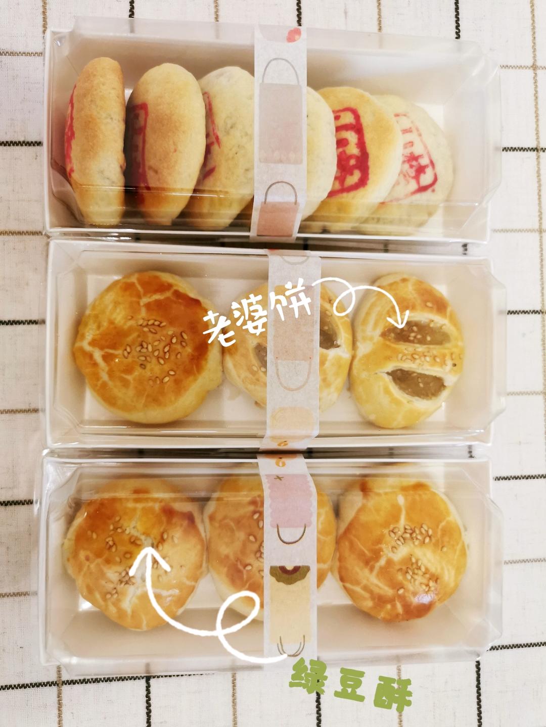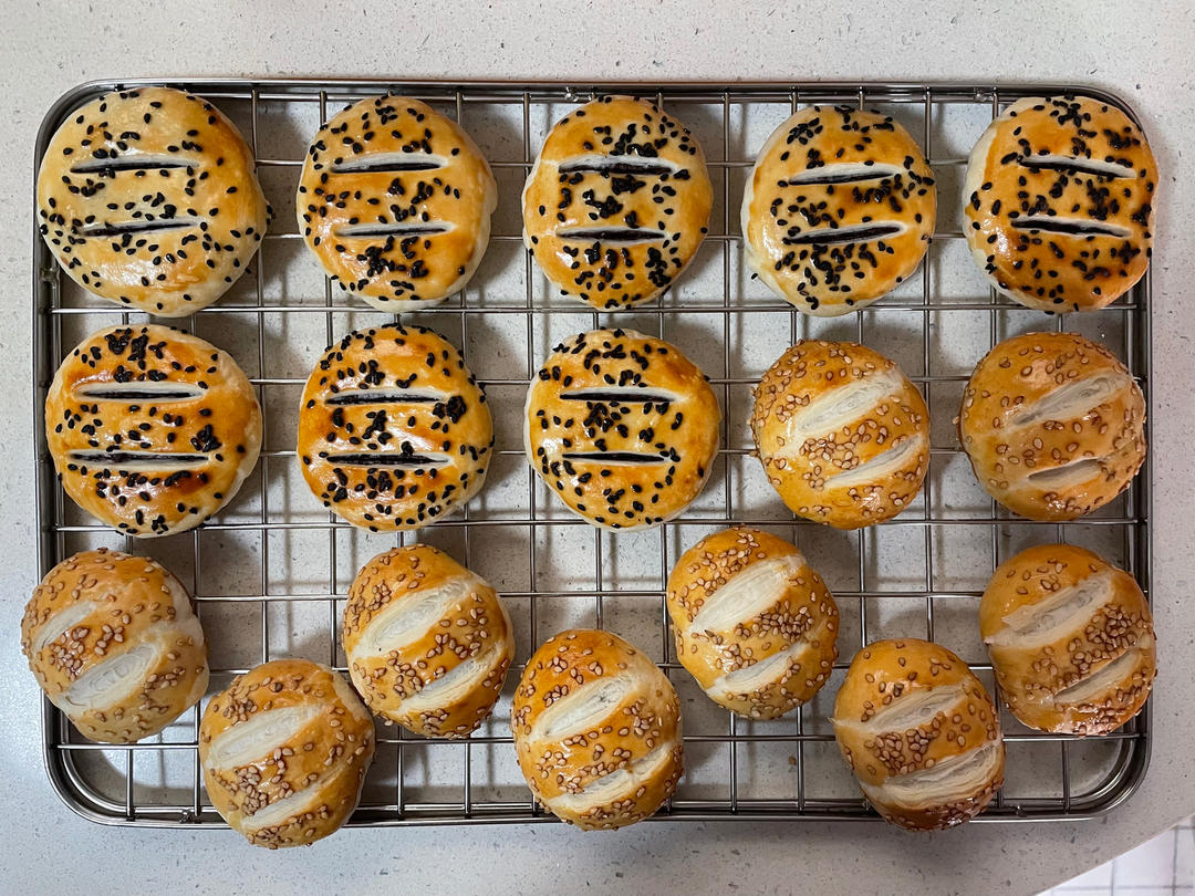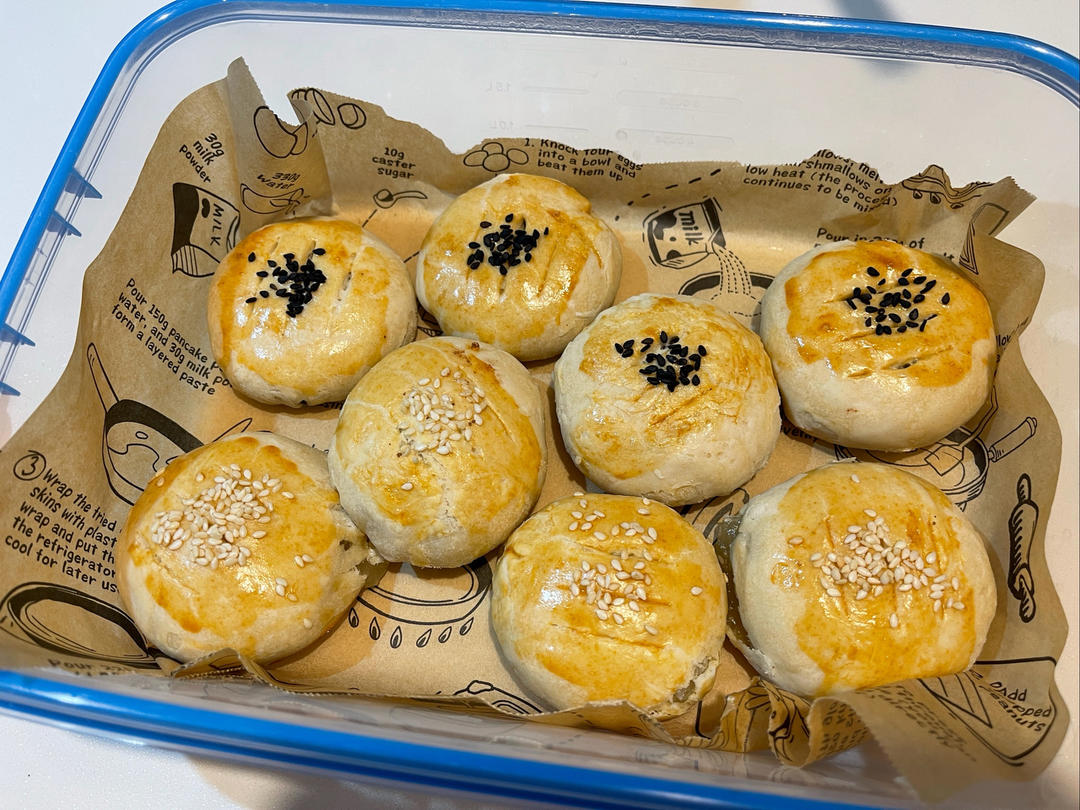 撒白芝麻的是按方做的老婆饼,190°/170°中下层25分钟,以为馅料会很甜,其实正好😃