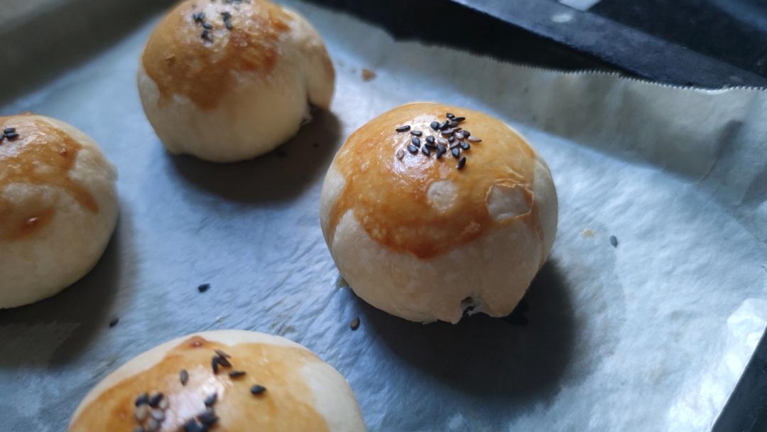 油皮的糖减为10g,猪油全部等量换成黄油,每个30g的自制红豆馅儿,180度中层26分钟~~nice~~