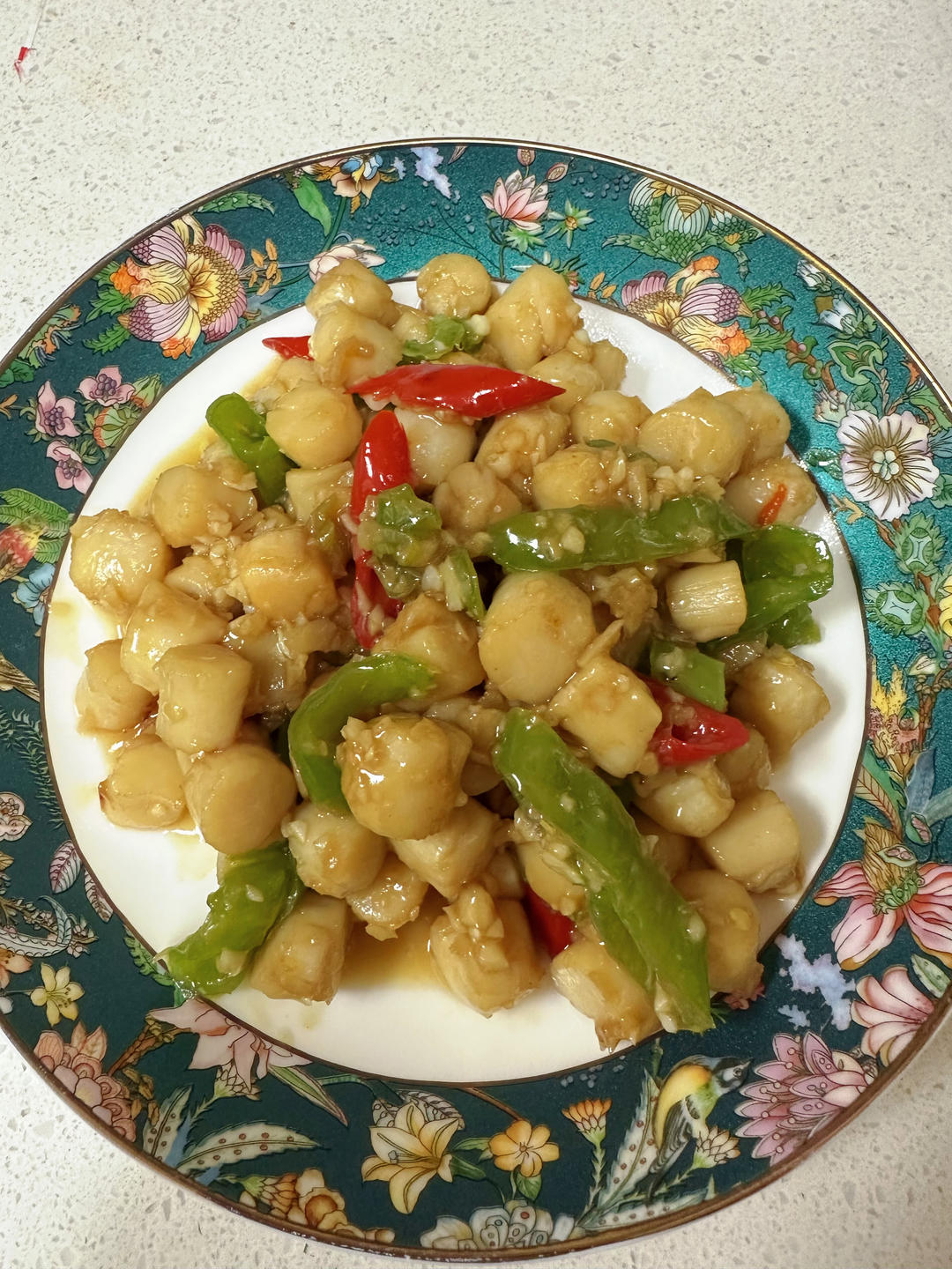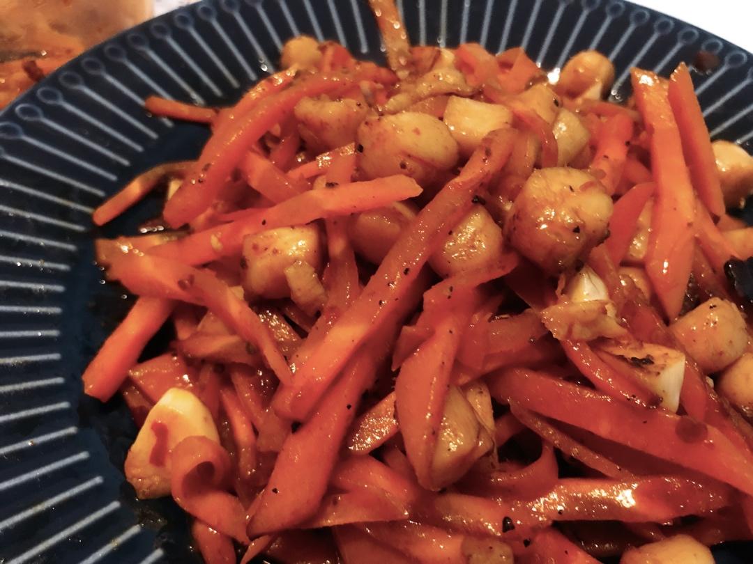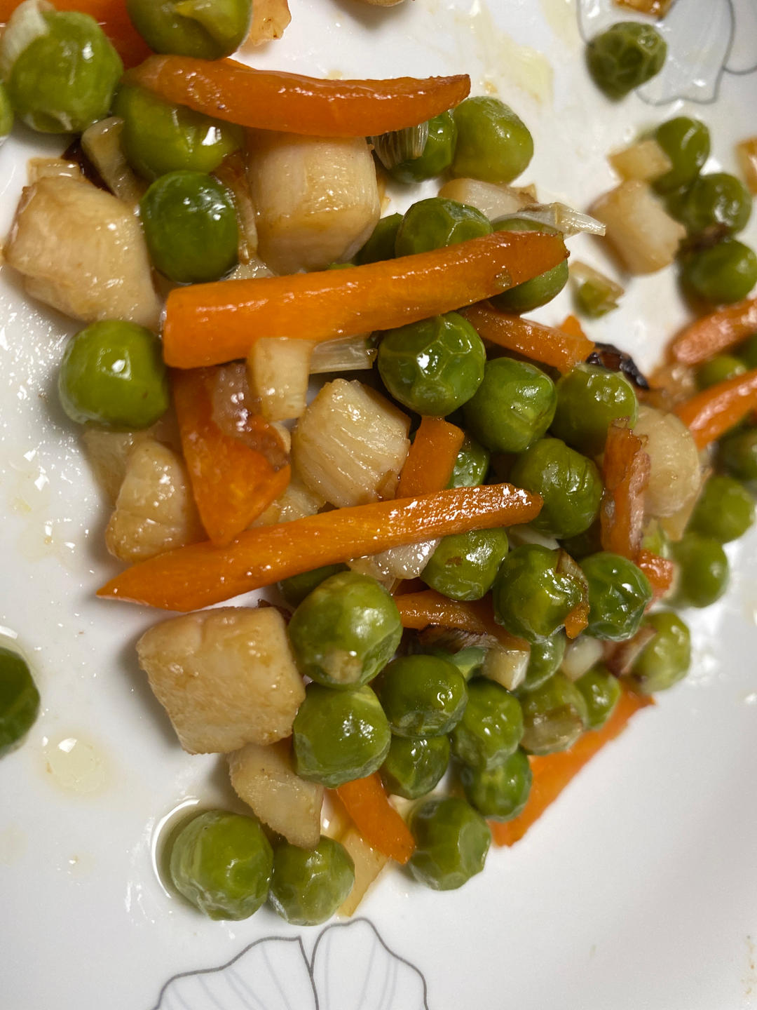 热油下葱花,下胡萝卜和焯过水的豌豆,然后下腌过的扇贝柱(酱油和姜丝),加少许蚝油和盐,好,出货