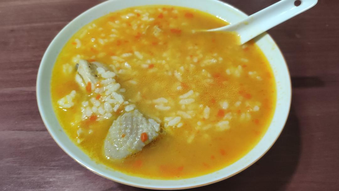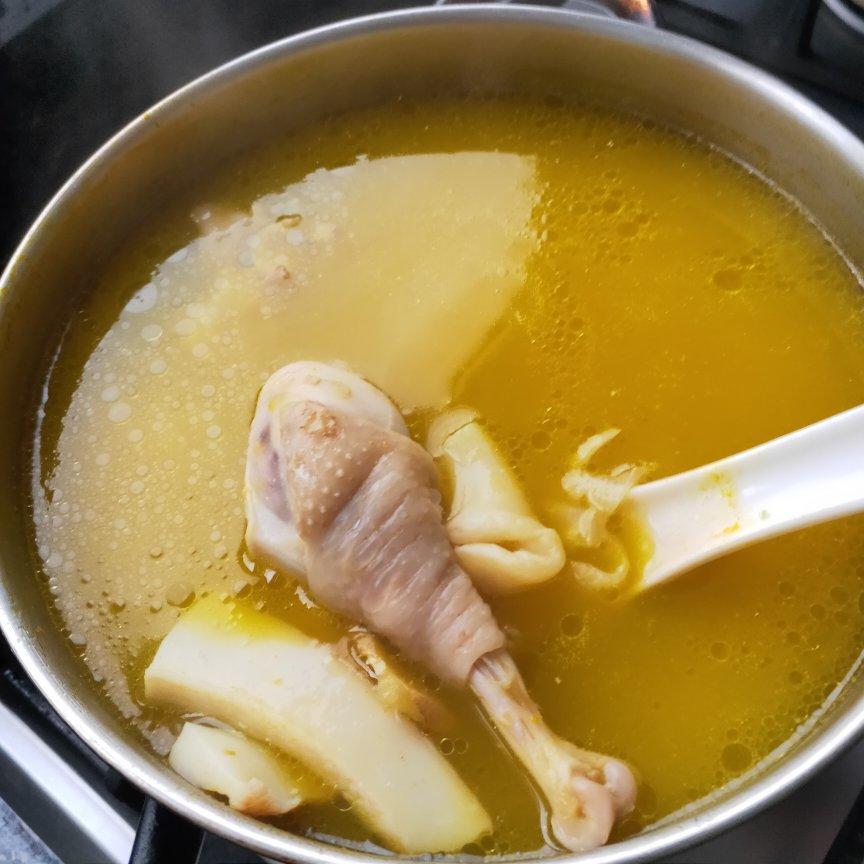 整只鸡一个人吃不完就拿鸡架炖汤,最后半小时扔个鸡腿进去。为了配色,还加了速冻西兰花。