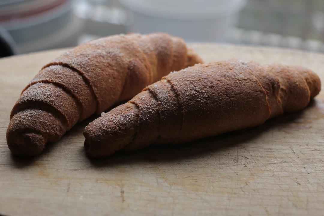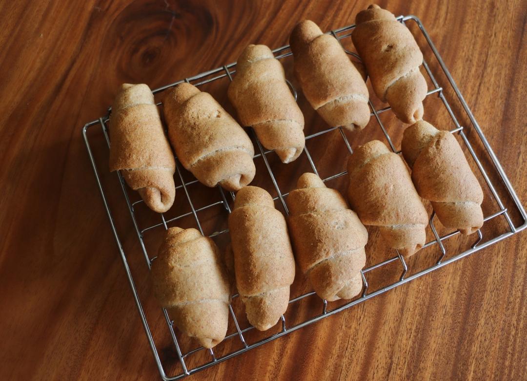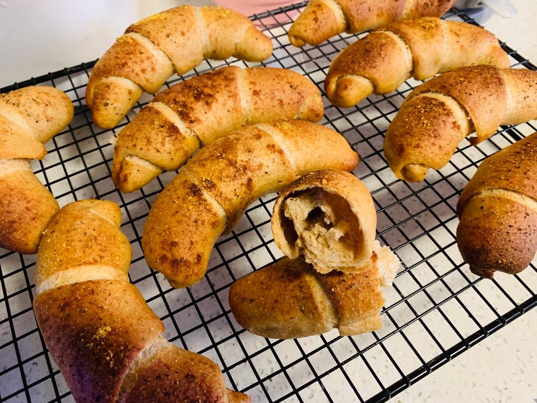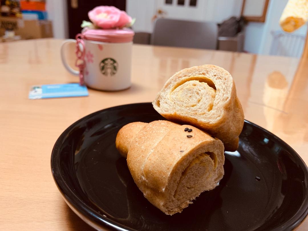 50g高筋50g全麦面包粉50g中筋黑麦粉,90g水,220g酵头,其他按比例✖️3➗2,卷了椰子油,二发融化全部漏掉了喂…不过还是很好吃!!!