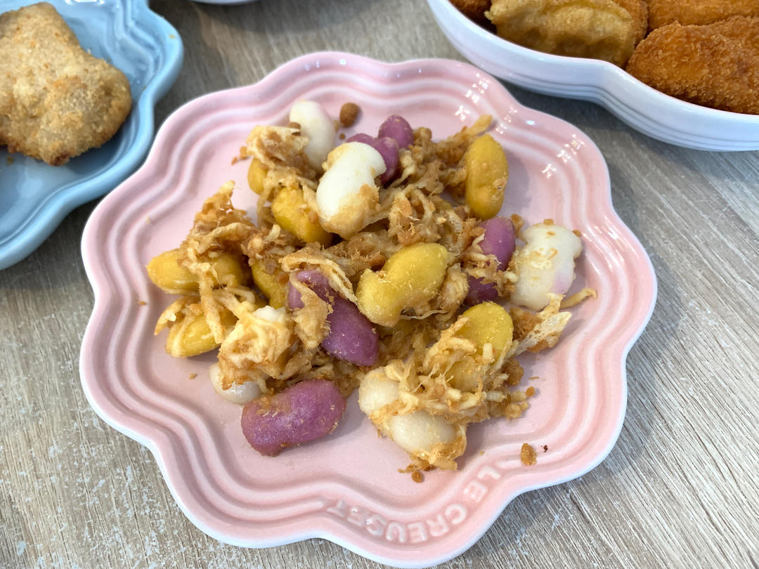 加了点肉松变成肉松芝士年糕了,挺好吃。我的小鱼年糕太小了,180度加盖8分钟,这样比较不容易干