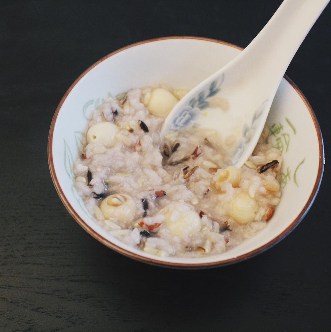 没有放博主说的糙米,莲子和普通米洗净,放5滴食用油,电饭煲预约7小时,熬3小时。简单好吃…