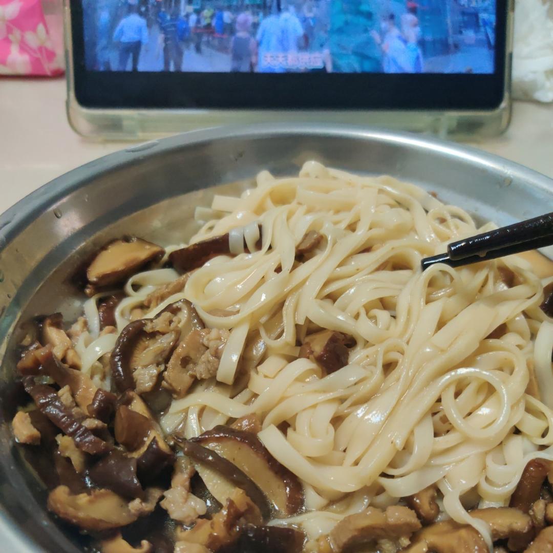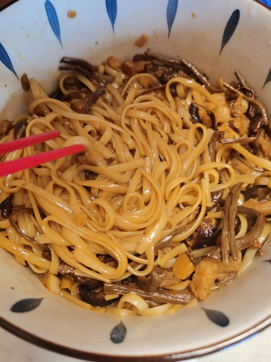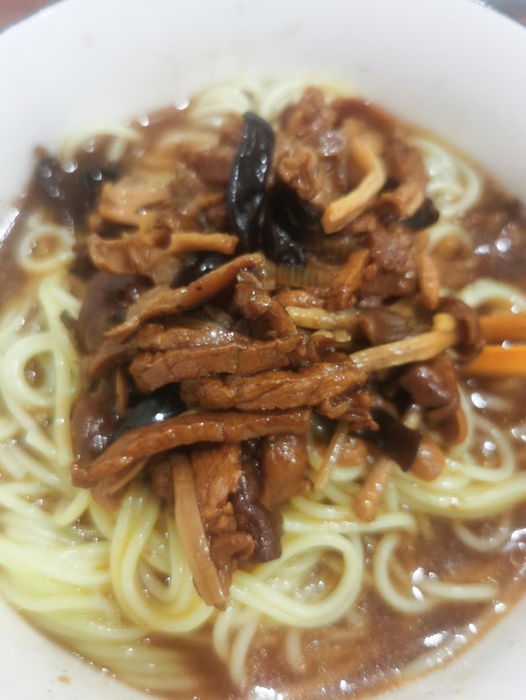 健身后补点碳水, 蘑菇面、加了这边超市买的泡椒罐头,超级好吃又温暖。