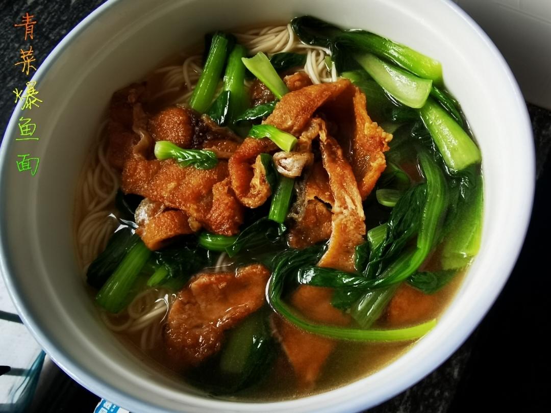 食材:菜场买的爆鱼、小青菜、盐、生抽等~~热油炒小青菜约2分钟,加盐后盖锅盖焖2分钟。再加水、生抽煮成底汤,加爆鱼和另起锅煮6分熟面条(在冷水浸凉备用),也锅即可。同理用蔡长青大排也非常快手好吃